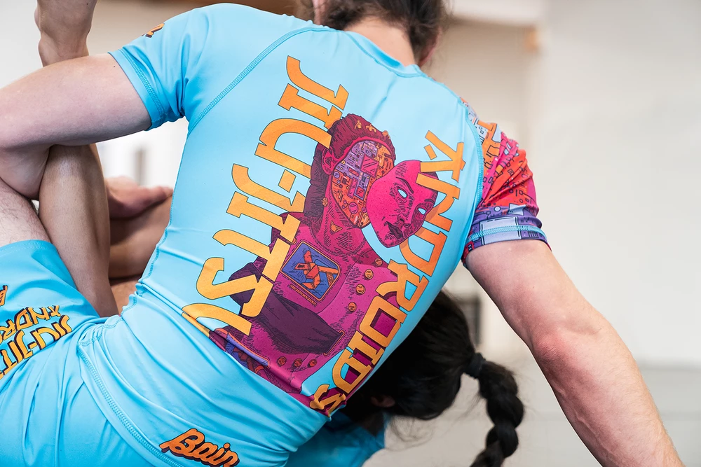Roll into Summer with this new super vibrant rashguard. Jiu-Jitsu Androids make for great training partners, no need to worry about sweat or wild uncontrolled movements, you can even set their ability level depending on how you feel on any given session. Just make sure to ALWAYS turn them off after use, BAIN is not responsible for any damages resulting from the misuse or abuse of our AI overlords super fun training partners…