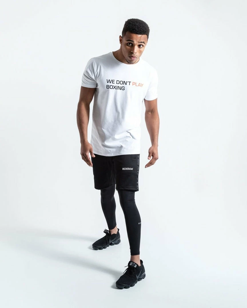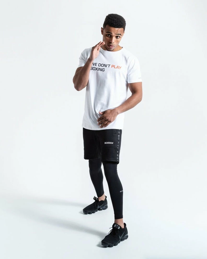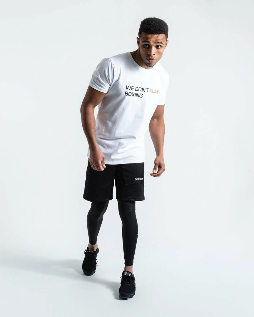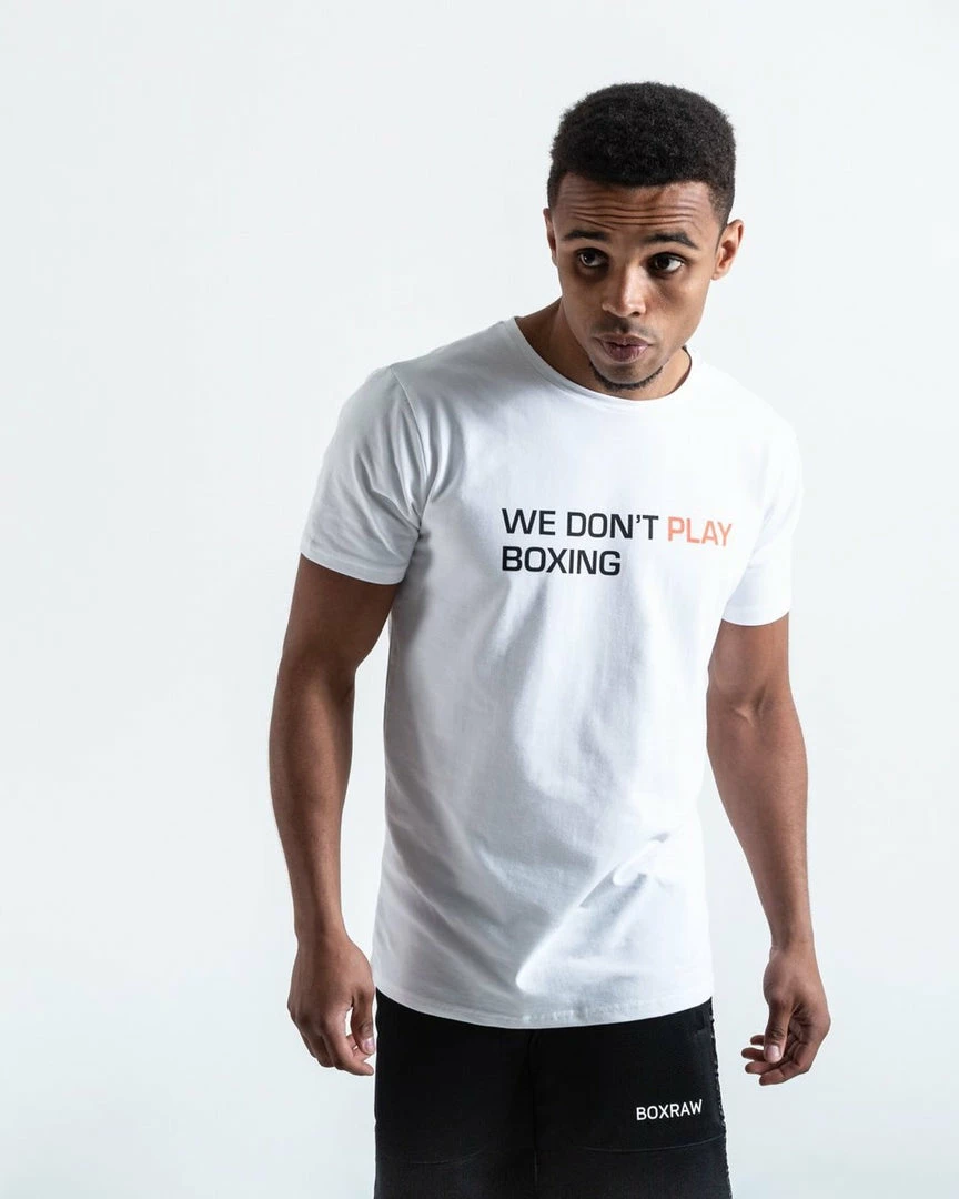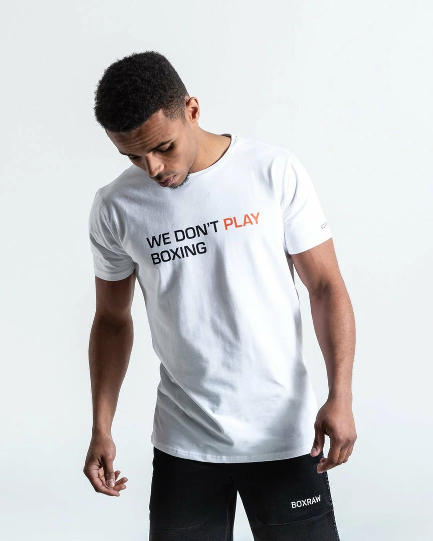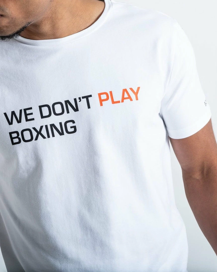 This stretch cotton tee features our signature We Don’t Play Boxing® slogan. If you know, you know. You can play football, basketball and baseball, but you can’t play boxing. A refined fit, that sits firm across your arms and chest, yet hangs spaciously around your torso.