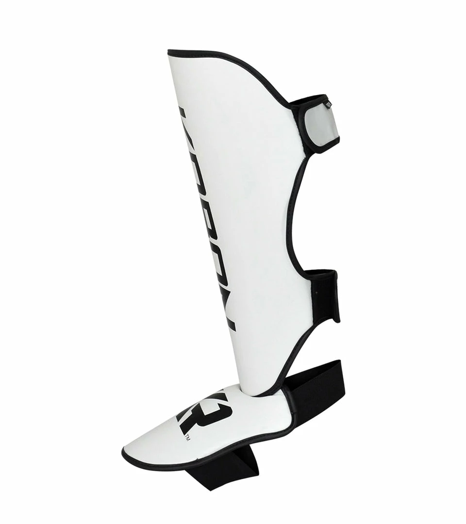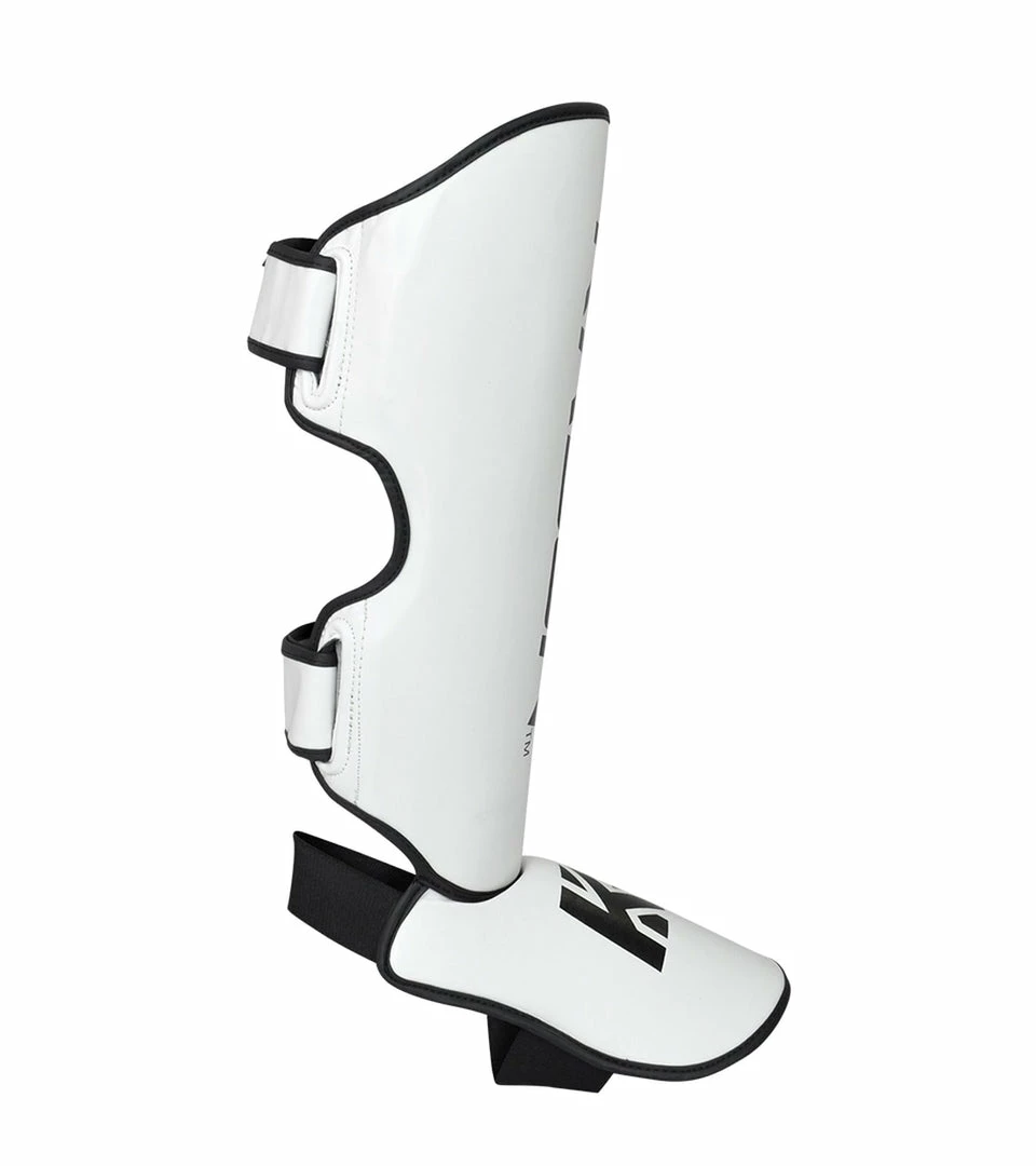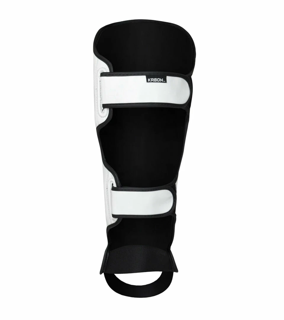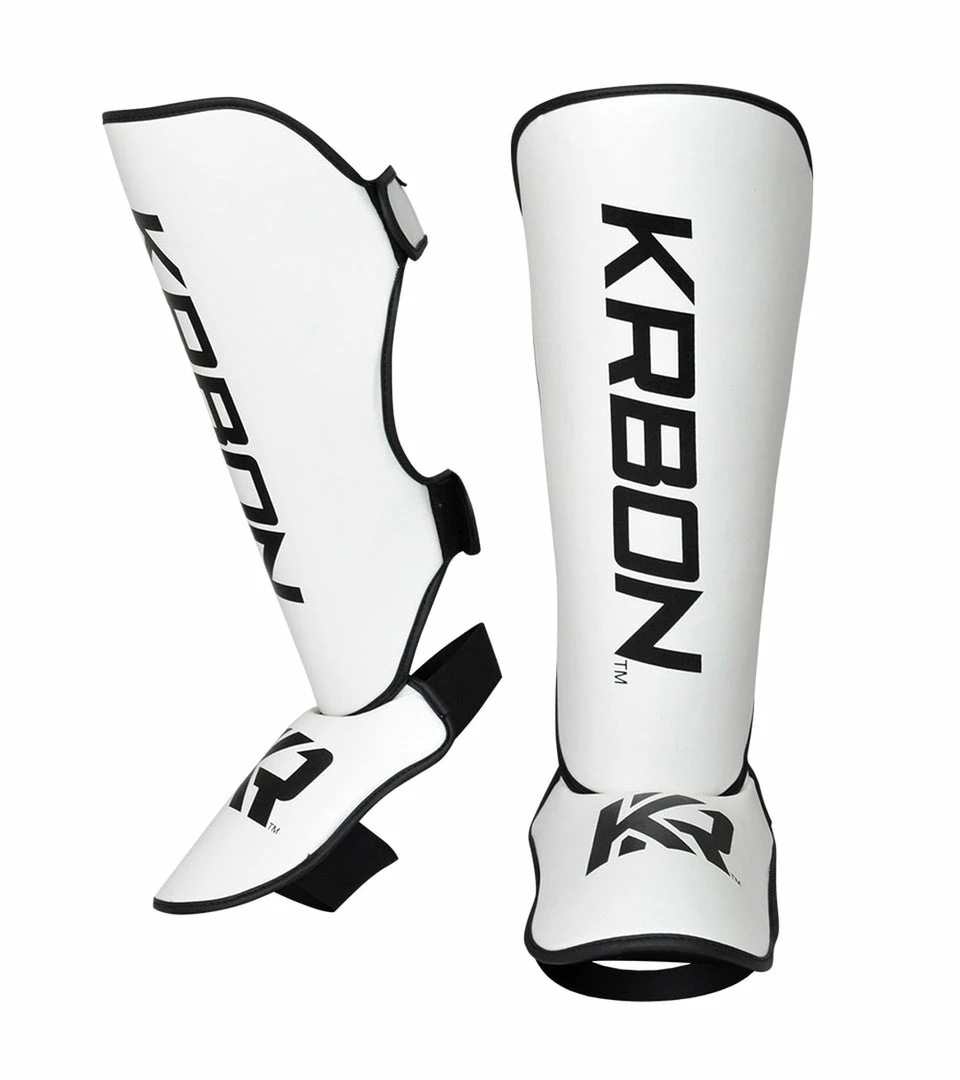 KRBON Muay Thai Shin Guards in White designed specifically for Muay Thai & Kickboxing. Lightweight, mobile, full coverage design is exactly what you need to perform at your best while training Muay Thai, Kickboxing and Mixed Martial Arts.Durable manufactured leather2 elastic behind the ankle and under foot strapsFull protection design