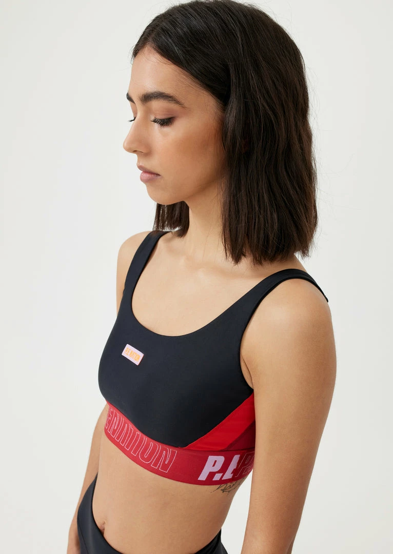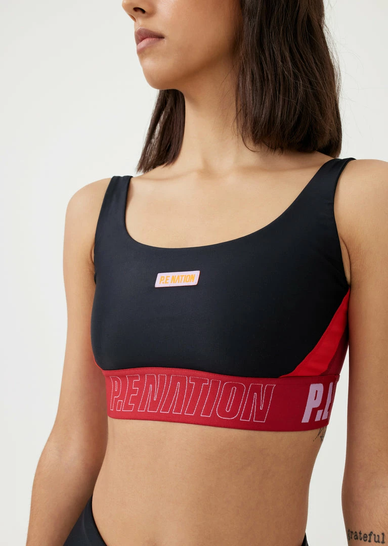 The Courtside Sports Bra in Black comes as part of the Stand Tall, Together Collection. An elevated retro-sport inspired style with statement appeal, the Courtside Sports Bra features a scoop neckline at the front and contrast adjustable straps for stability during low- to medium-intensity training sessions. Featuring bright side panelling for signature P.E colour blocking, with P.E Nation branded jacquard waistband and keyhole back strap for a fresh and fun vibe. Pair it with the Courtside Legging on training days, or the Courtside Trackpant when downtime is in play.