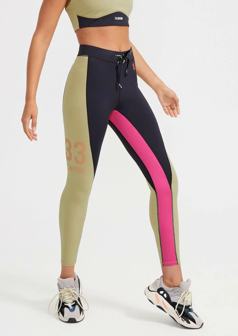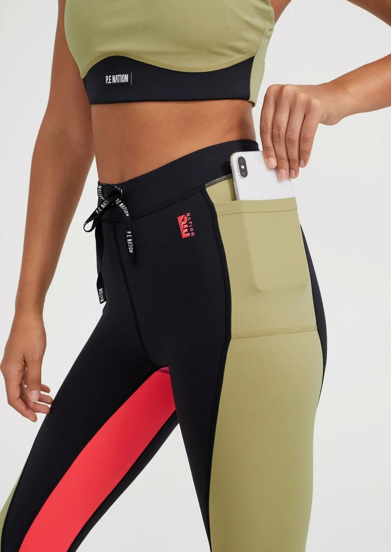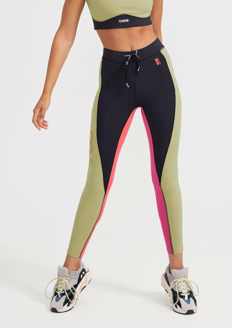 The Double Team Legging in Olive comes as part of the Work It Downtown Collection. Designed to support your every move, from high-intensity training sessions to low-impact or off-duty days, the Double Team Legging boasts true P.E Nation colour-blocking appeal in a bright and forward colourway. The high-rise full length legging features black waistband and panels at front and back, muted khaki side panels and colour blocked inside panels for a standout statement look. Cut from our ultimate high-performance sustainable fabrication, the Double Team Legging is squatproof, with a compressive yet lightweight feel. Pair yours with the Double Team Sports Bra for a complete in-studio set.