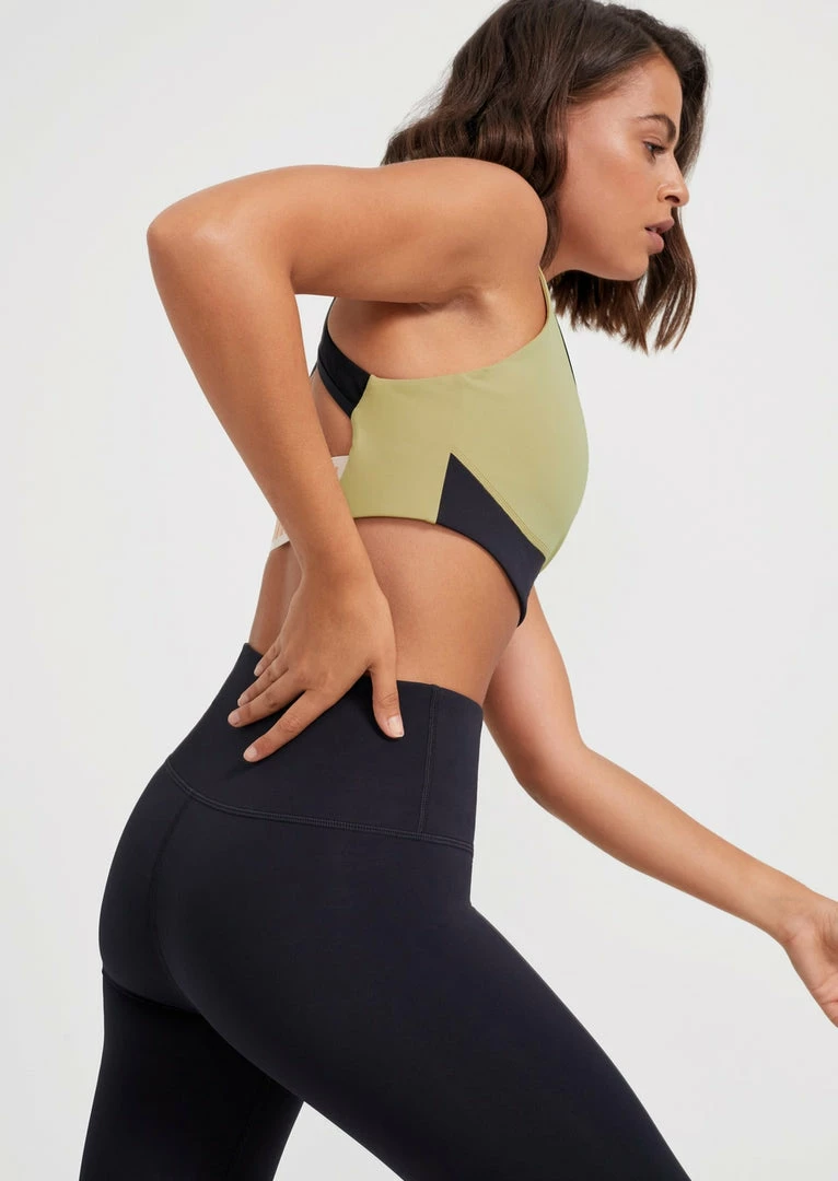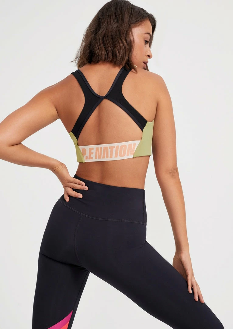 The Double Team Sports Bra in Olive comes as part of the Work It Downtown Collection. Designed to support you through high-intensity activities, the Double Team Sports Bra is cut from our ultimate performance sustainable fabric, developed from regenerated Nylon yarns. Lightweight and flexible with a compressive feel and slight matte finish, the Double Team Sports Bra features a neat black mesh racerback and a scoop neckline at the front. A wide encased waistband elastic adds extra support, while a P.E Nation jacquard elastic at the back provides subtle stretch for a comfortable fit. Pair it with the Double Team Legging or Triple Double Legging for a complete training day set.