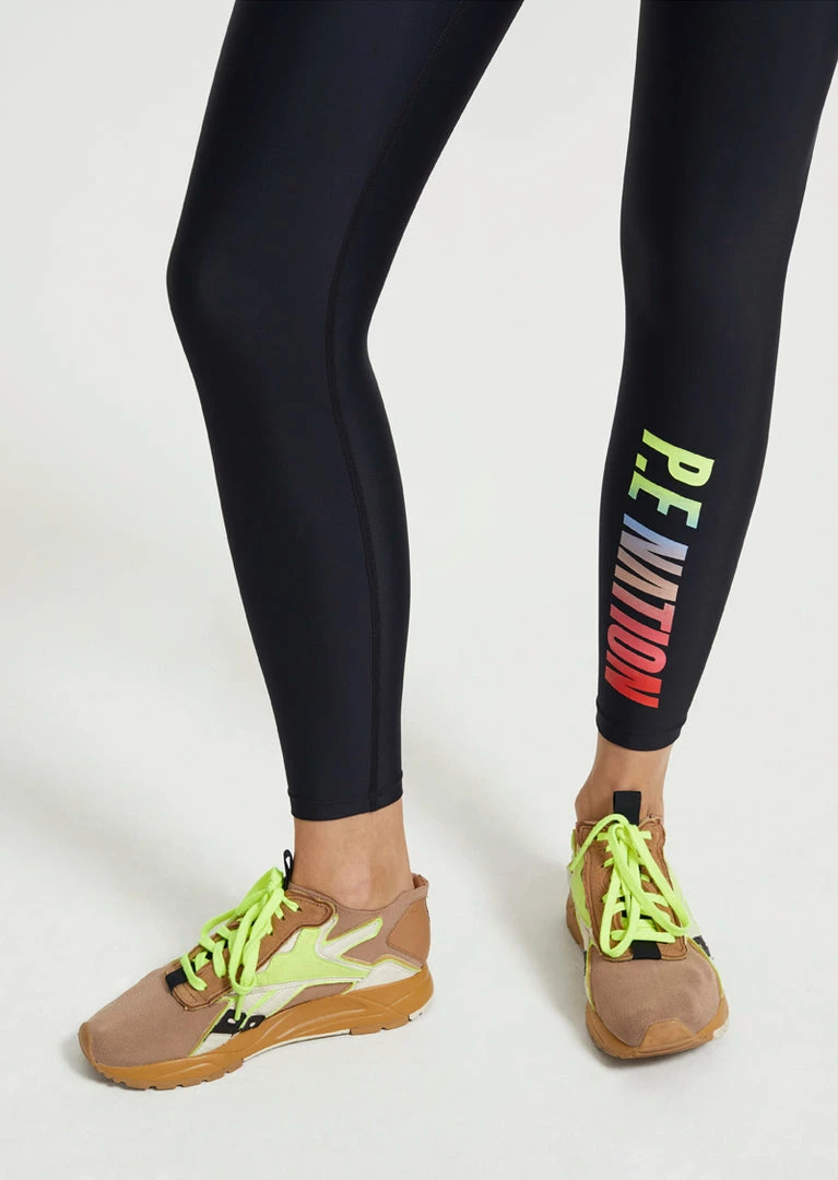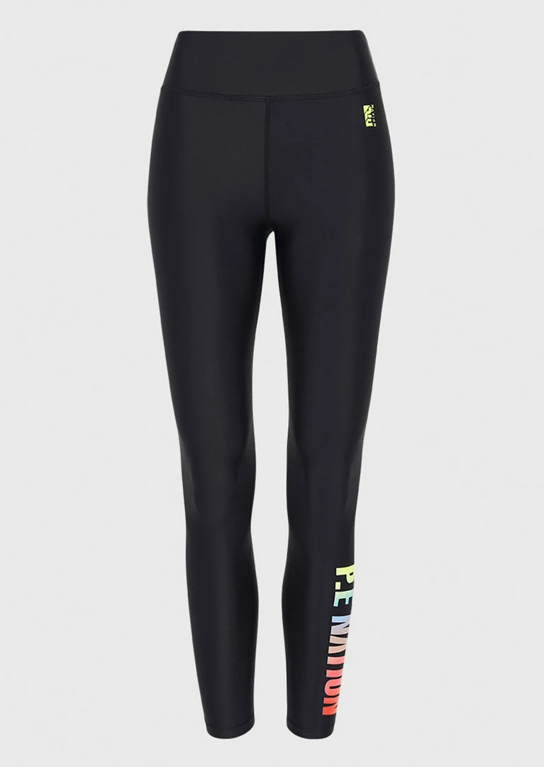 The Emerging Legging is a sleek 7/8 length active staple crafted from a lightweight sustainable fabrication with a shiny finish. Featuring a mid-rise waistband with shapewear power mesh for core support and the P.E pop of colour in a gradient of neon hues on the left calf and fluro logo on the hip. Wear this compact, breathable leg for any workout from spin class to boot camp.