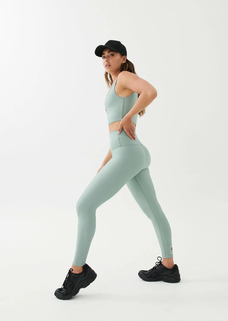 The Grand Stand Legging in Iceberg Green comes as part of the Colour Up Collection. A super-soft active style with a compressive feel and breathable, recycled fabrication, the Grand Stand Legging is a high rise 7/8 length leg specially designed to support your every move through all levels of training intensity. Featuring soft built-in folded waistband support and P.E Nation logo detailing at the back ankle, it’s a perfect in-studio piece paired with the Grand Stand Sports Bra.