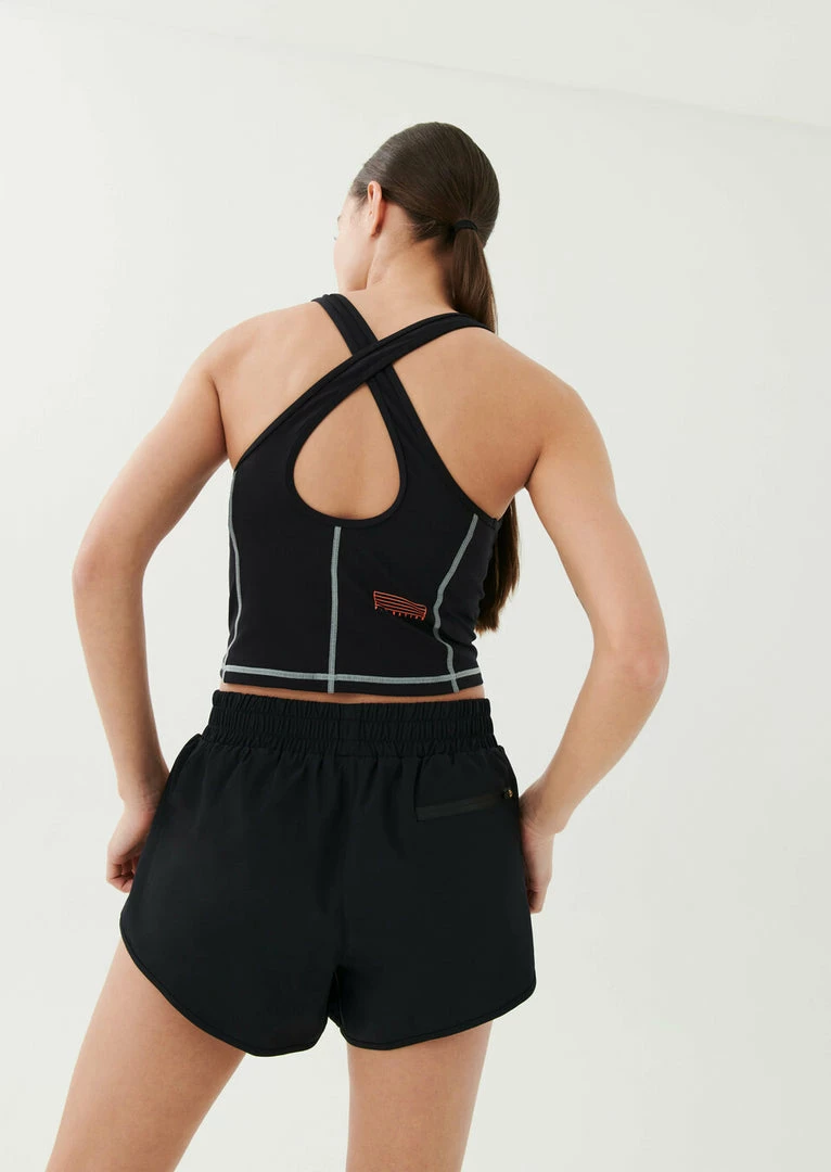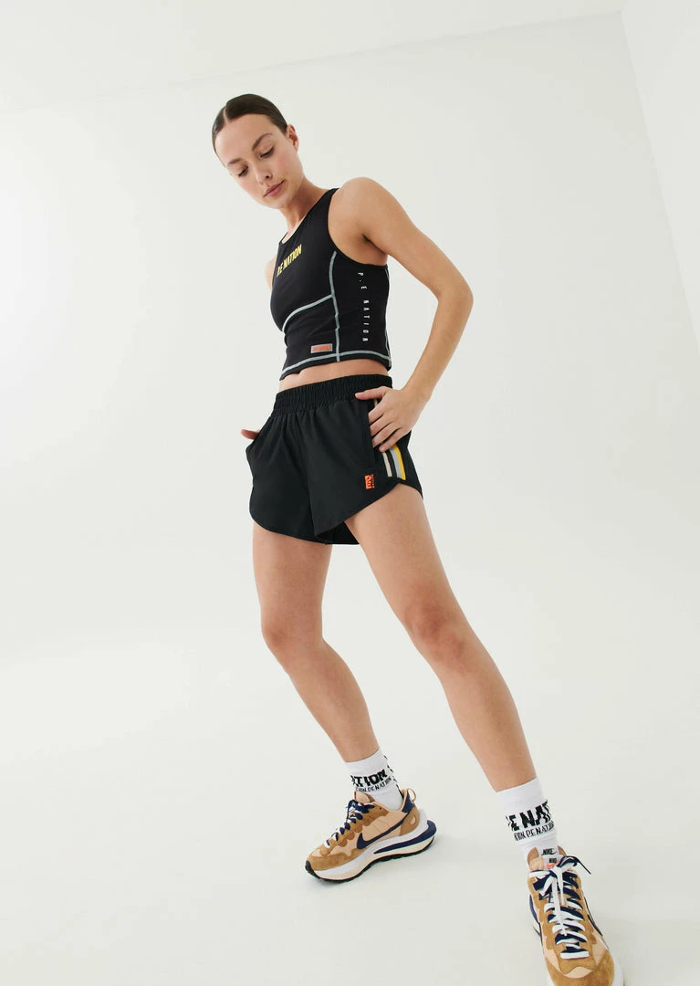 The In Goal Short in Black comes as part of the Stand Tall, Together Collection. A relaxed fit style designed to sit mid-waist, the In Goal Short has an internal brief and is made using recycled polyester for a sustainable training day essential. Featuring an elastic waistband with internal P.E Nation drawstring cord, and a back pocket with zipper to store small essentials on the move. A stripe print at the side panels give it a retro aesthetic and signature P.E Nation look.