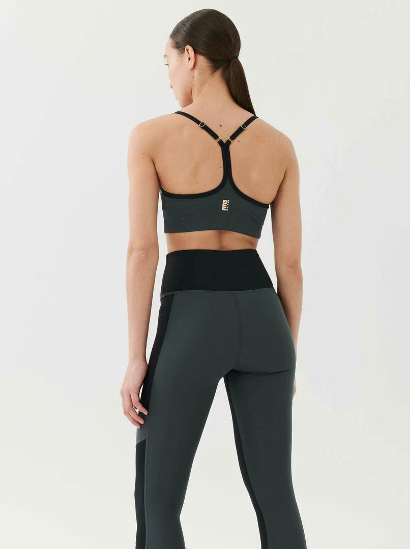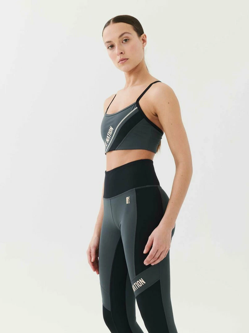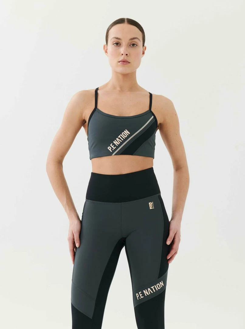 The League Sports Bra in Charcoal comes as part of the Stand Tall, Together Collection. A mid-length style with racerback and slim adjustable straps, the League Sports Bra features asymmetrical contrast diagonal panels and coverstitching at front for a retro sport vibe. A P.E Nation logo print at the front balances with a P.E Nation embroidered logo at centre back. The League Sports Bra has an elasticated waistband for support during low-medium intensity activities. Pair it up with the League Legging for a full studio fit, or the Post Game Trackpant for lowkey days.