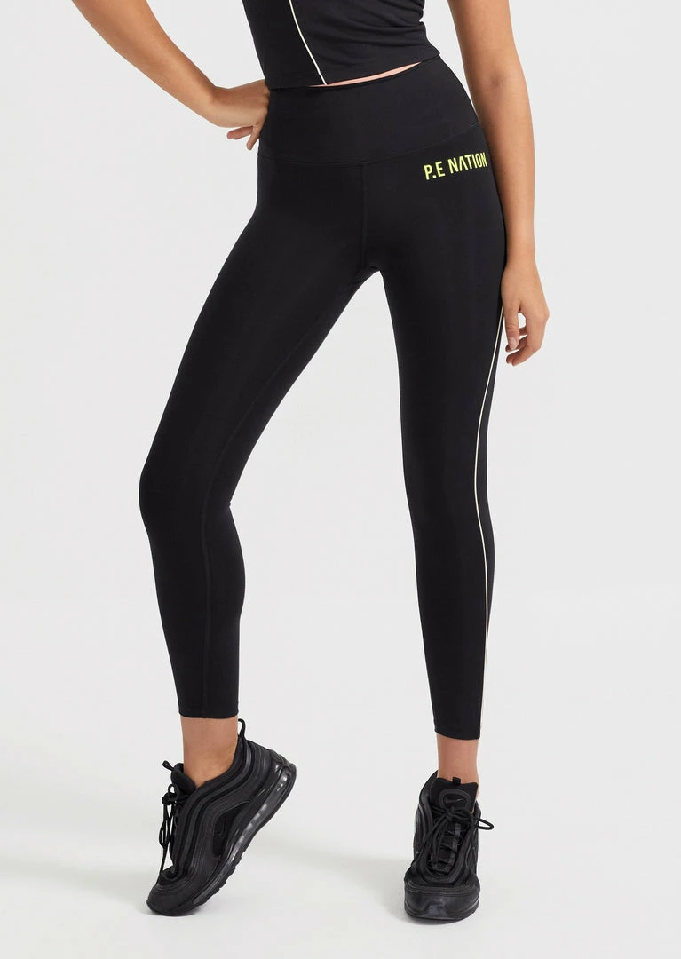The Match Play Legging in Black comes as part of the Work It Downtown Collection. A classic high rise 7/8 length P.E staple, the Match Play legging features contrast pipe panelling at front and just below the hips for extra flattering shape and fit. Cut from soft opaque matte fabrication, the Match Play Legging is perfect for all-day wear, and its four-way stretch makes it an ideal choice for low-intensity yoga and Pilates sessions. Pair it with the Match Play Sports Bra for a complete P.E Nation in-studio set.