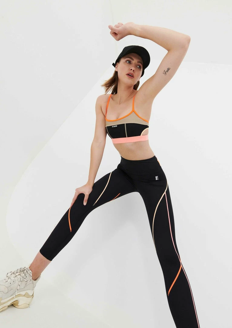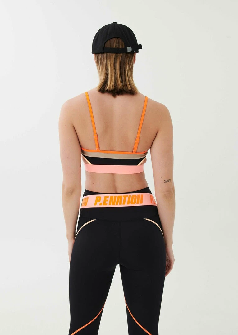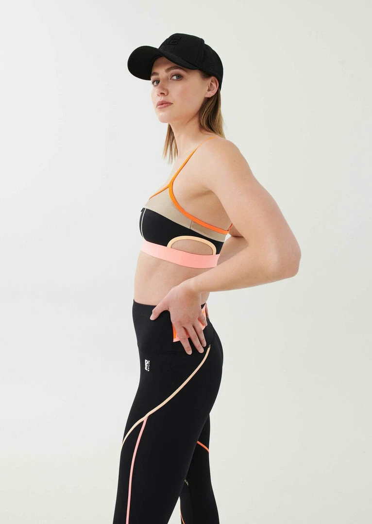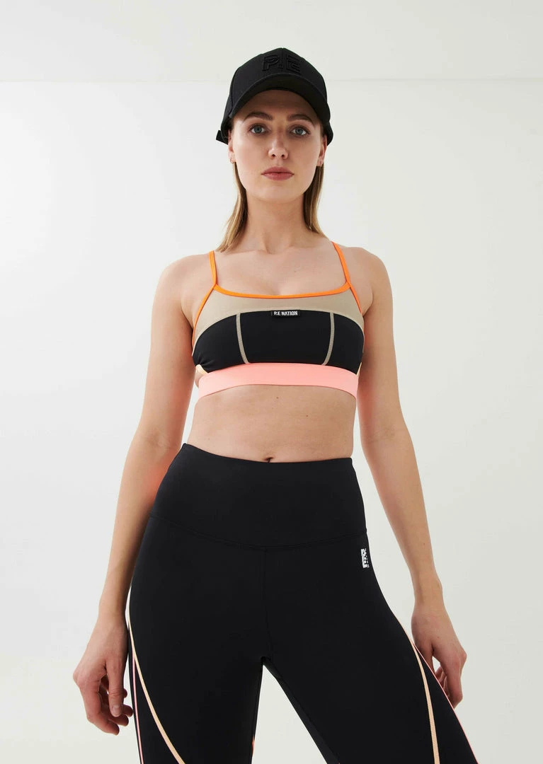The Scoreboard Sports Bra in Black comes as part of the Colour Up Collection. Made from 78% recycled nylon and designed to support you during low- to medium-intensity training sessions, the Scoreboard Sports Bra keeps the pace, with a firm yet stretchy elasticated waistband underbust, and adjustable fluro shoulder straps for an individual fit. Signature colour-block panels in a mix of metallic, matte and bright blocks, the Scoreboard Sports Bra features cut-out details on the sides for an elevated active look. A subtle P.E Nation logo woven tag front completes the crop. Team it with the Double Cross Legging or Game Changer Legging on active days.
