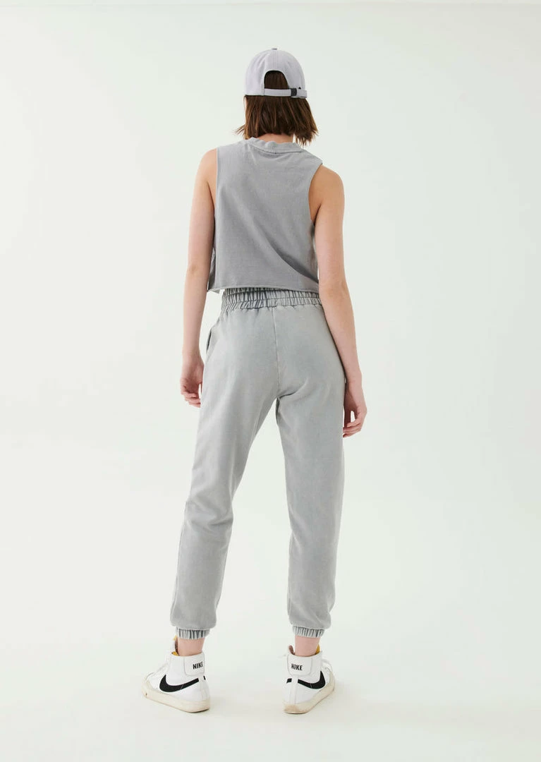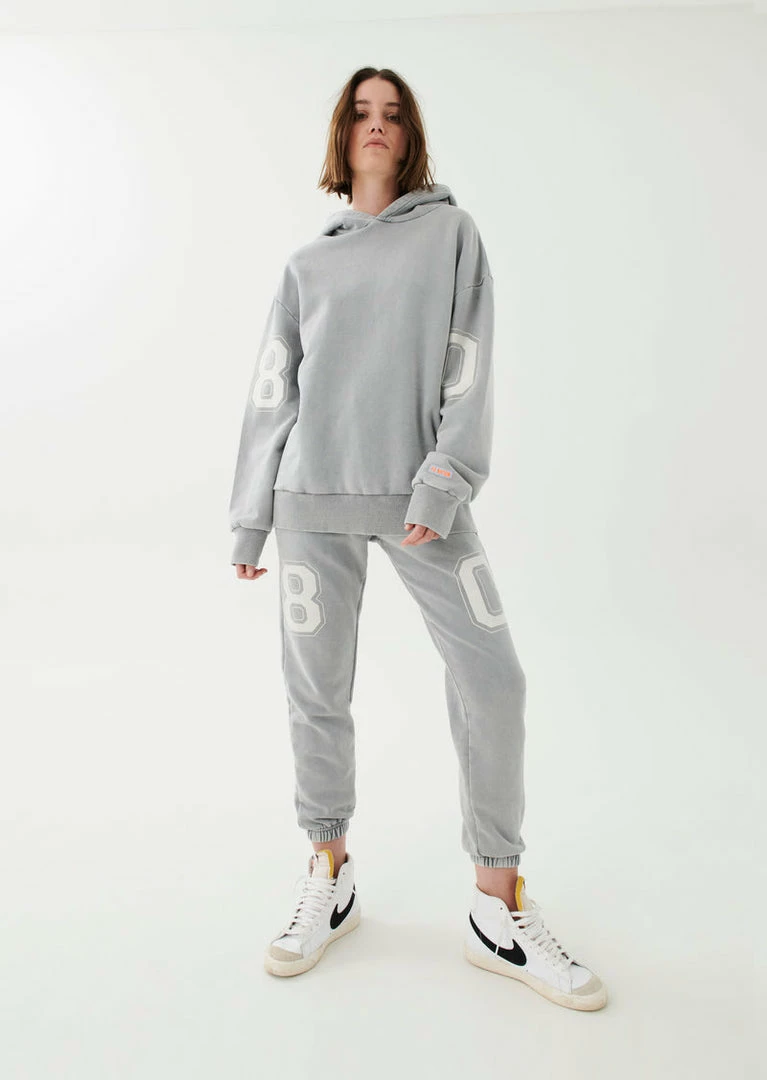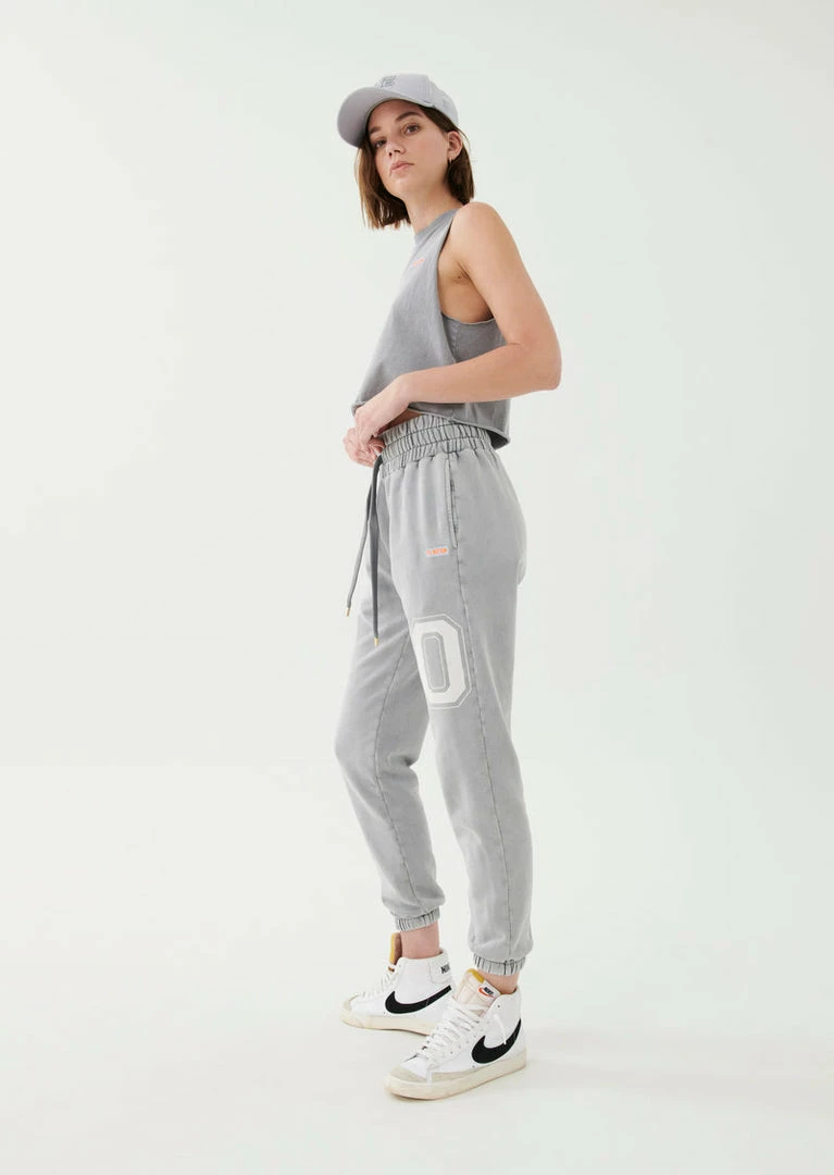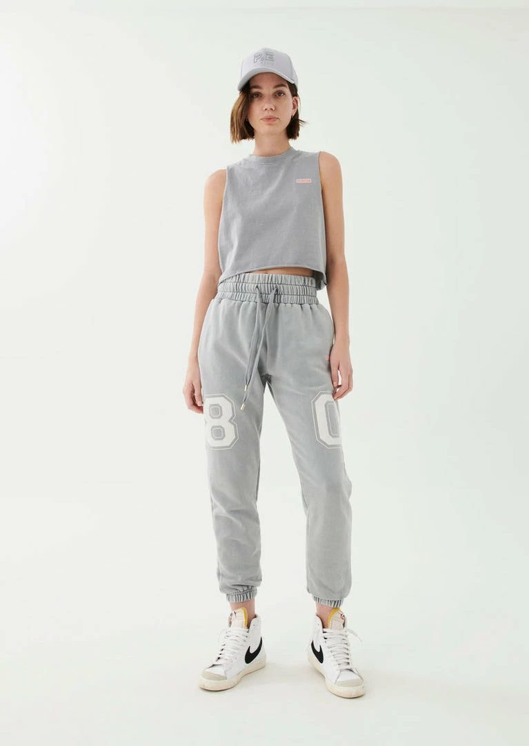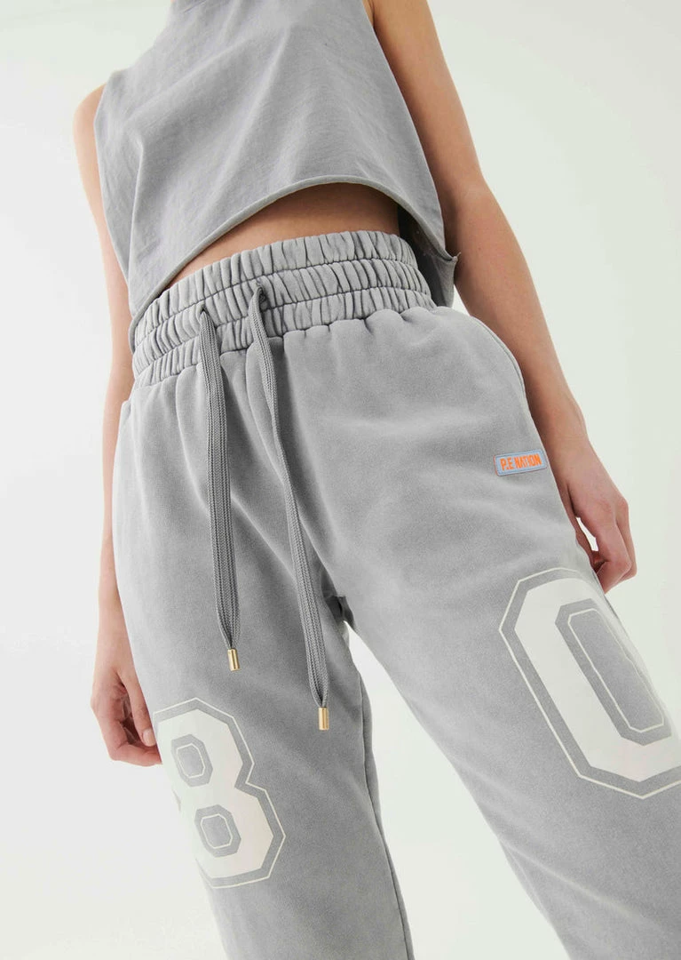 The Solar Trackpant in Silver comes as part of our Adventure Is An Attitude Collection. A relaxed-fit sweatpant with wide statement waistband and tonal shoelace-style drawcord, the Solar Trackpant is a supreme street-wear layer to work into your all-everything wardrobe. Featuring a soft midweight brushed French Terry inner, the Solar Trackpant has been enzyme washed for a vintage appearance and unique finish for each one-of-a-kind garment. The sweatpant includes side welt pockets, a P.E Nation ‘80’ contrast varsity graphic on the legs and a P.E Nation fluro logo patch near the hip. Team it with the Solar Hoodie for the perfect head-to-toe taking it easy fit.
