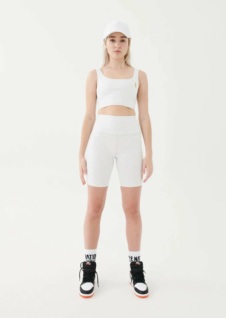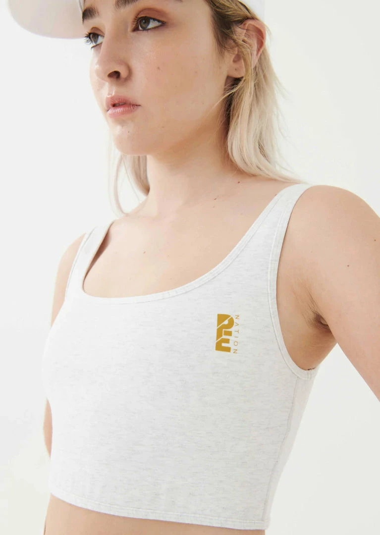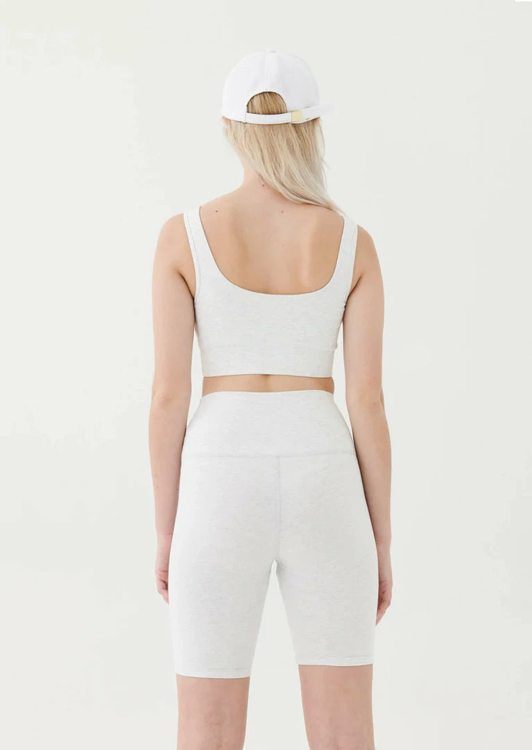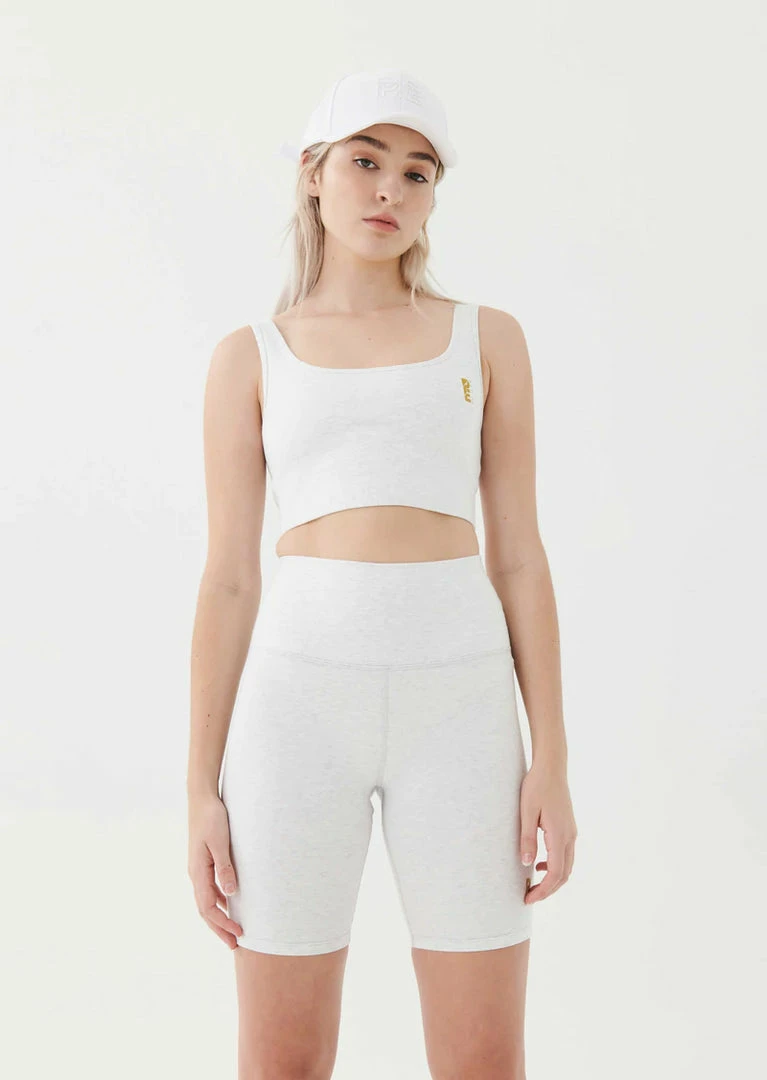 The Swift Sports Bra in Grey Marl comes as part of our It’s All In Me Collection. An ultra butter-soft matte organic cotton crop with a matte finish and scoop neckline front and back, the Swift Sports Bra features a long-length finish with a soft elasticated band underbust. Built for low-impact activities, the Swift Sports Bra features one full colour to match tone on tone, or clash up with brights and prints. A P.E Nation reflective gold logo sits at front. Team it with the Swift Short and Swift Legging.
