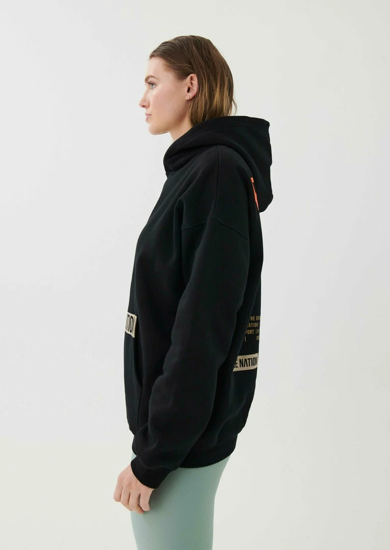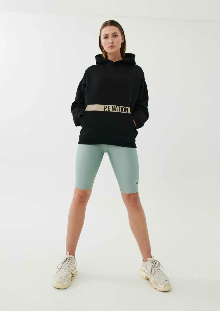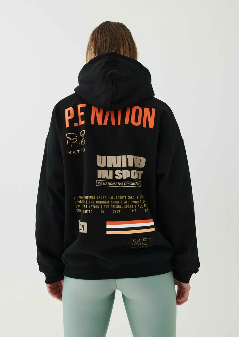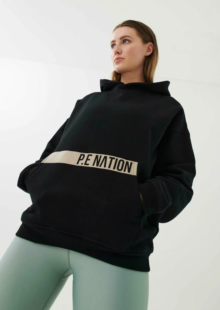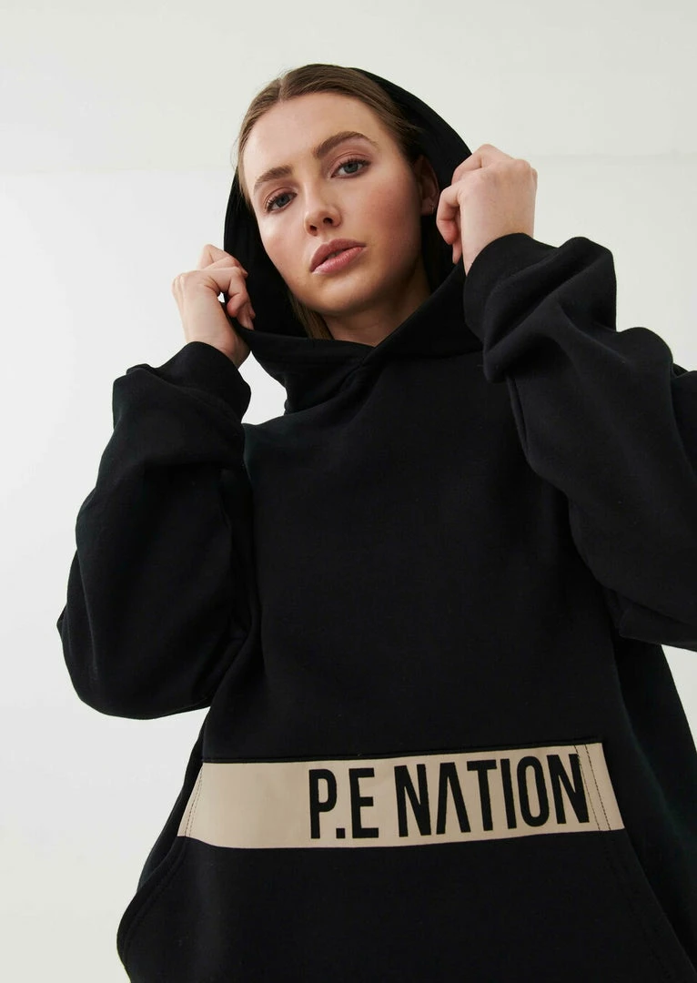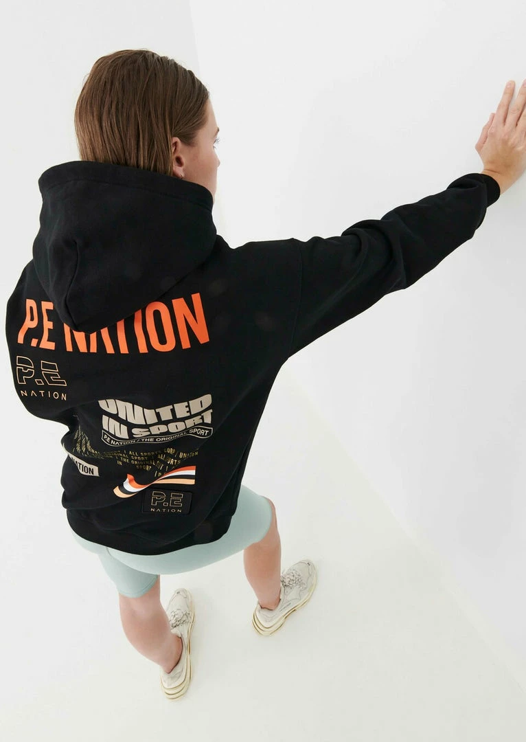 The Base Jump Hoodie in Black comes as part of the Colour Up Collection. A relaxed-fit hoodie cut from midweight 100% organic cotton with a soft brushed interior for a supreme off-duty feel, the Base Jump Hoodie features a generous hood and classic pouch pocket at front. A minimal flat rubber print P.E Nation logo across the pouch pocket at front is teamed up with multi-colored P.E Nation logo detailing all across the back, in fluro, gold foil and muted tones for a heritage P.E Nation vibe. Featuring the original P.E Nation flag graphic and a recycled woven patch for a further elevated look and feel. Team it with the Game Changer Legging or Airball Legging on the move.