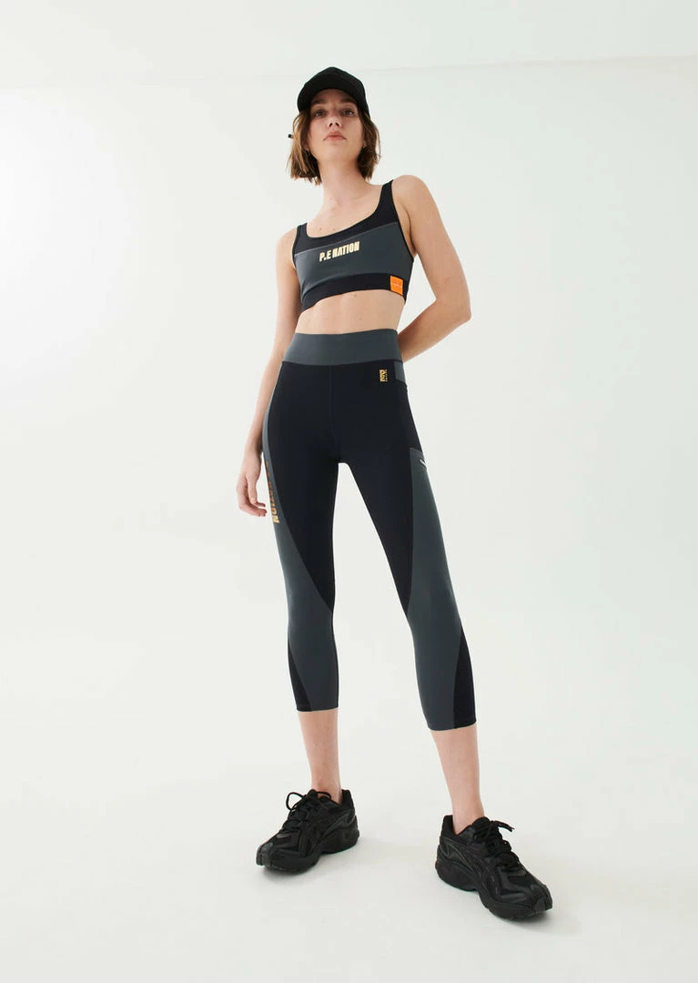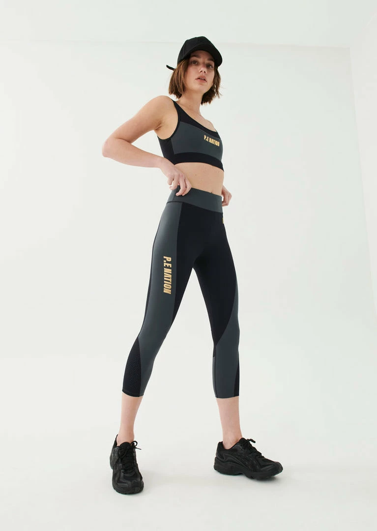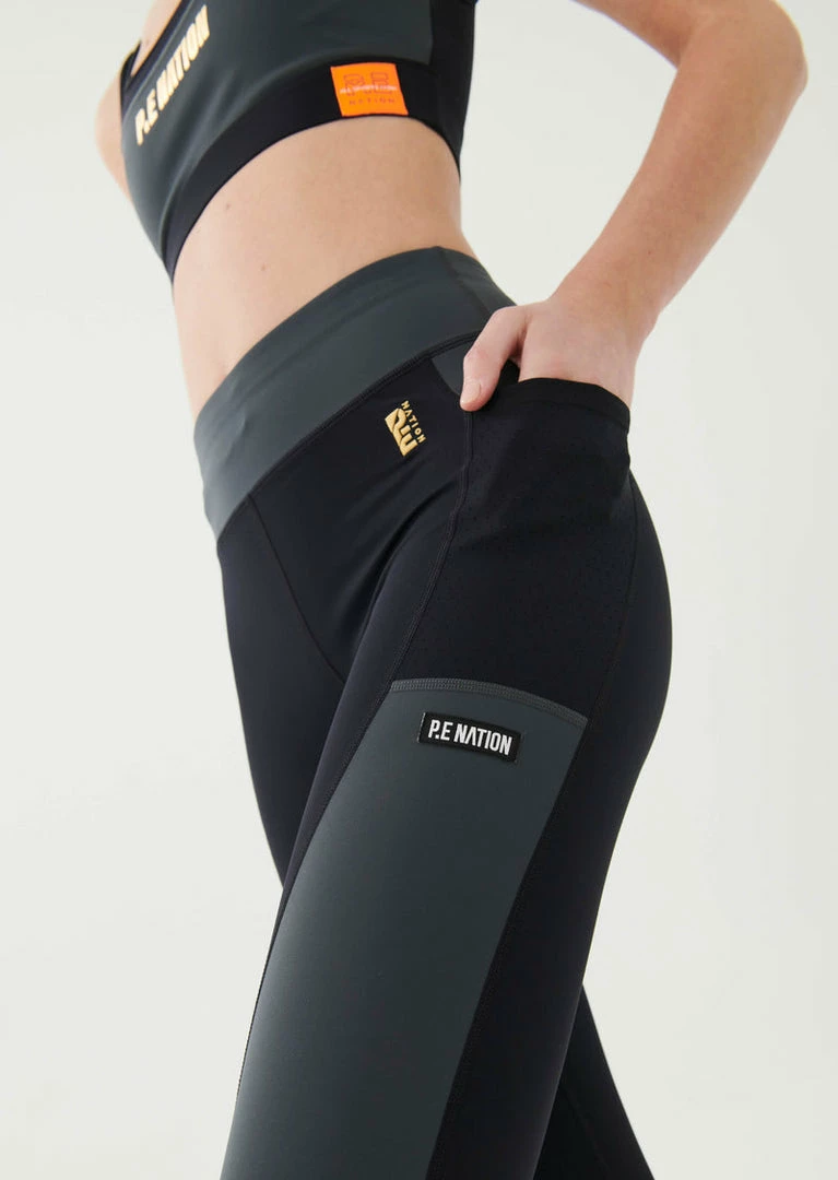 The Blast Legging in Dark Grey comes as part of our Adventure Is An Attitude Collection. A high rise 3/4 length style, the Blast Legging is designed for running and medium intensity training sessions. A compressive, breathable sustainable fabrication has a second-skin feel for free range of motion as you move. Perforated paneling on the lower legs is matched with a perforated side pocket to store neat essentials. An elasticated waistband features an internal P.E Nation drawcord. Multi-logo detailing includes an embroidered P.E Nation logo at the hip, logo badge on the left leg and vertical foil logo on the right leg. Team it with the Blast Sports Bra for a full training day fit.