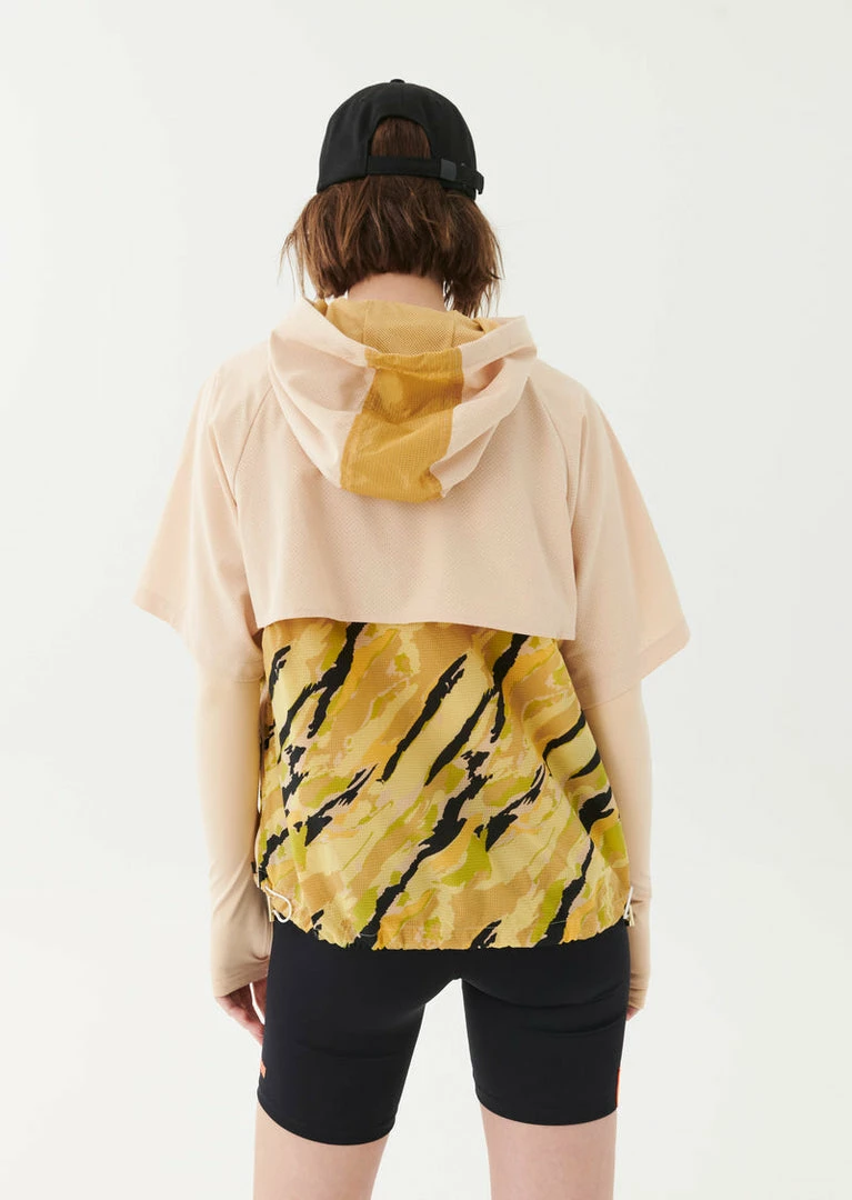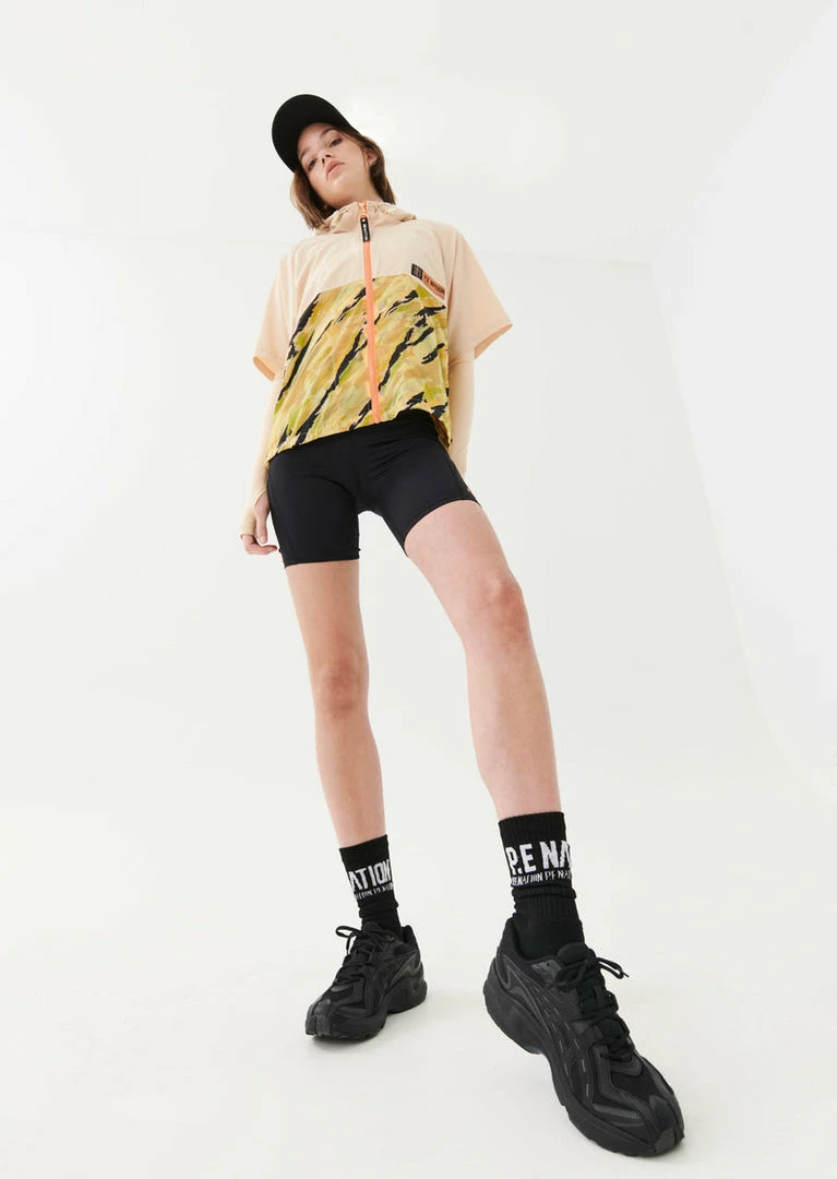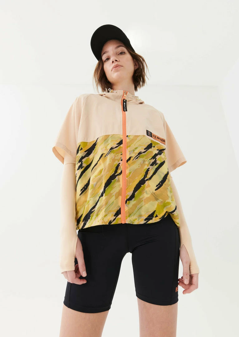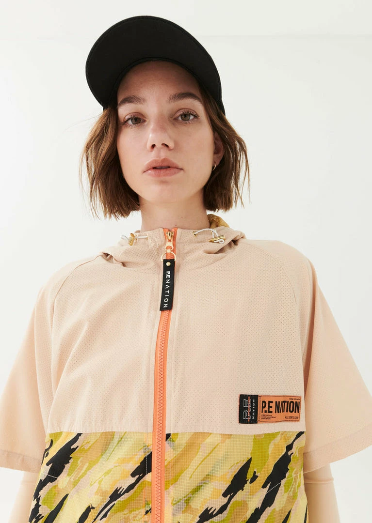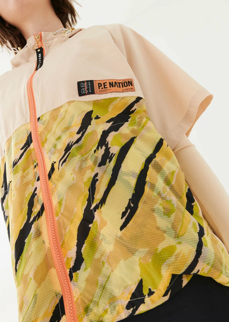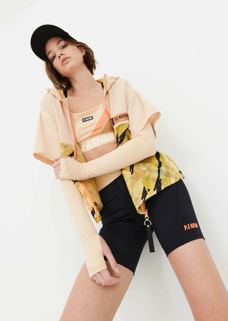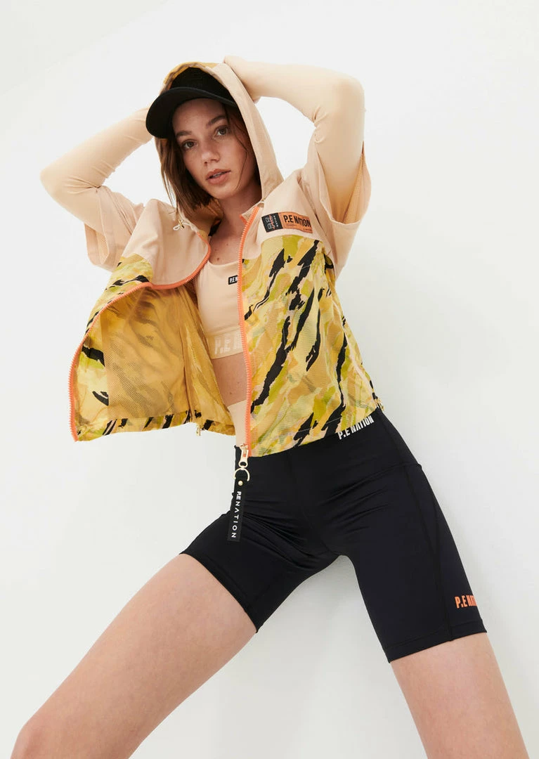 The Stellar Jacket in Print comes as part of our Press Play Collection. A super lightweight spray style layer with micro mesh detailing and a silky, light-as-air feel, the Stellar Jacket brings a brand new silhouette to the P.E Nation stable. A unique combination layer, the Stellar Jacket merges sleek fitted long sleeves with thumb holes, with a relaxed fit spray body with mesh lining for added comfort and breathability. A fluro zip centre front brings that P.E pop, clashed with the citrus tones of the custom digital tiger print detailing. Gold-plated trims bring signature elevation to the piece, with double-ended zipper features at the seams – zip down to wear as a pocket; zip up to switch up the silhouette and add further ventilation. We love the Stellar Jacket paired with the Comeback Legging, Uprise Legging, Double Under Short, Stellar Short or Full Time Short in Sirocco.